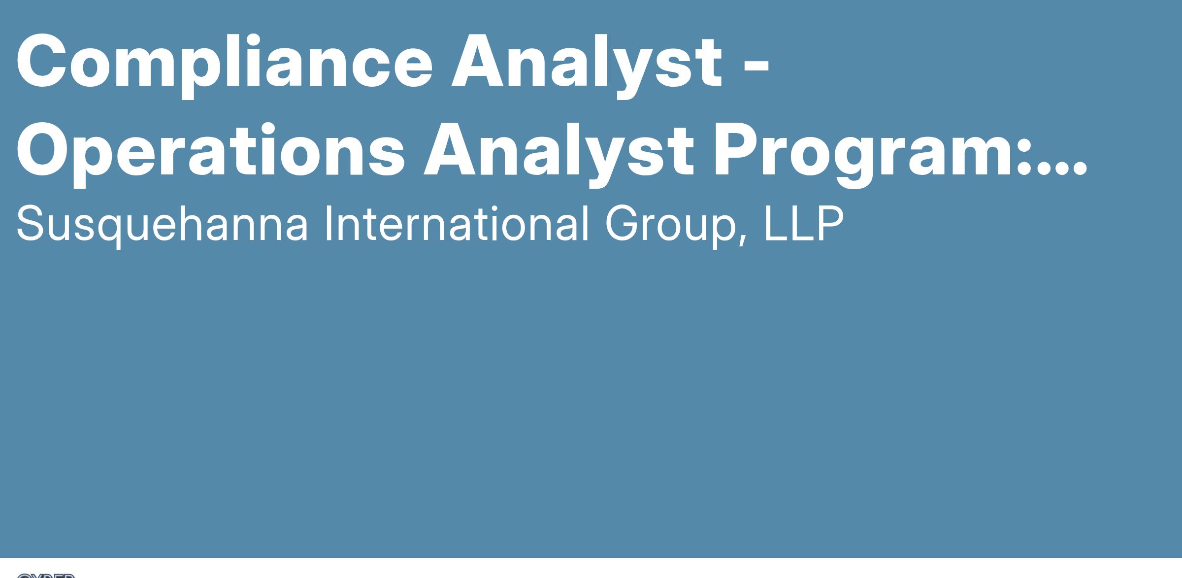 The Operations Analyst Program is a rotational development program that offers a broad and in-depth exposure to business operations at Susquehanna and will prepare you for a Compliance Analyst position that immediately impacts our business.