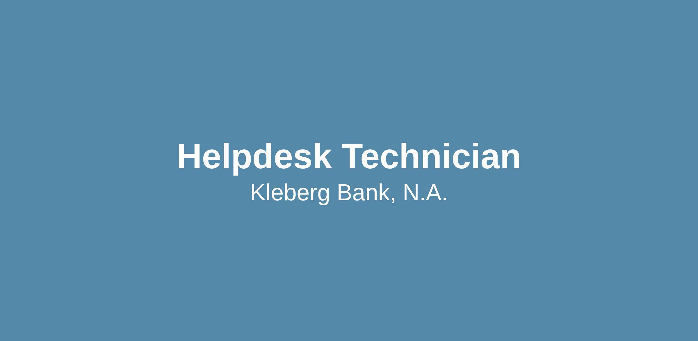 Kleberg Bank, N.A. believes that the customer’s experience is our Brand. Each individual at Kleberg Bank, N.A. is committed to providing “Excellent” customer service. The Helpdesk Technician role reports directly to the Bank's IT Manager. The Helpdesk Technician uses interpersonal, communication, and technical skills. The technician will diagnose and resolve issues by asking probing questions, and also by using the knowledge base, remote access, and enterprise tools. The Helpdesk Technician will increase employee efficiency and Kleberg Bank competitiveness through technology support.