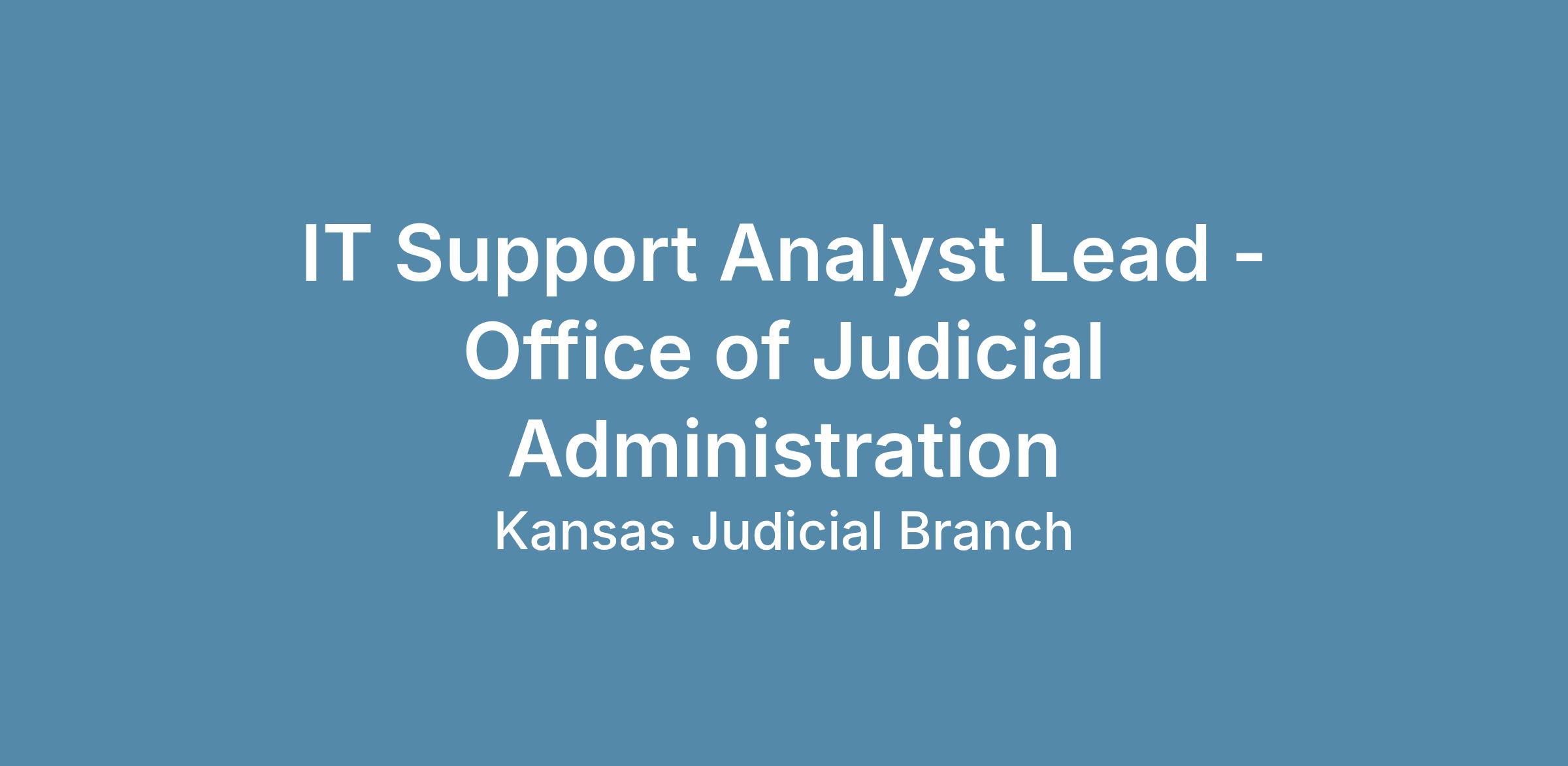 Position number: K0045017 Location of Employment: Office of Judicial Administration, Topeka, KS 66612 Position Title and Salary: IT Support Analyst Lead, grade 47, $ 78, 404.73 annually Kansas Judicial Branch BenefitsState Employment Center - Benefits (ks.gov)