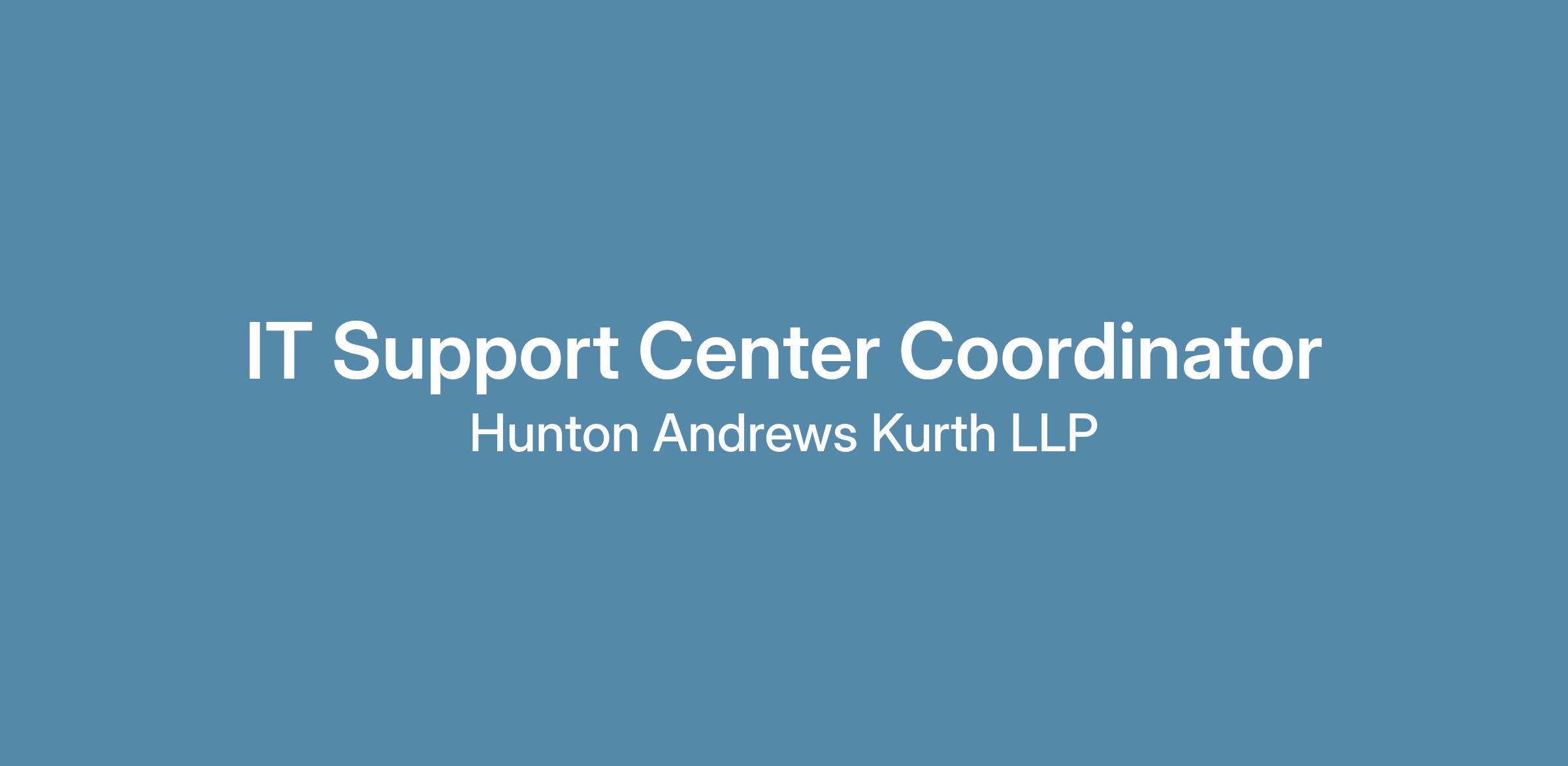 Hunton Andrews Kurth LLP, an international law firm, is actively recruiting an IT Support Center Coordinator. This position provides first tier support for firm technology requests, questions, and problem resolutions. Responsible for positive user experience through timely and accurate resolution and documentation of issues and requests. Acts as intradepartmental coordinator for IT Support Center and other IT groups. Helps maintain organizational security and assist users with best practices related to security.