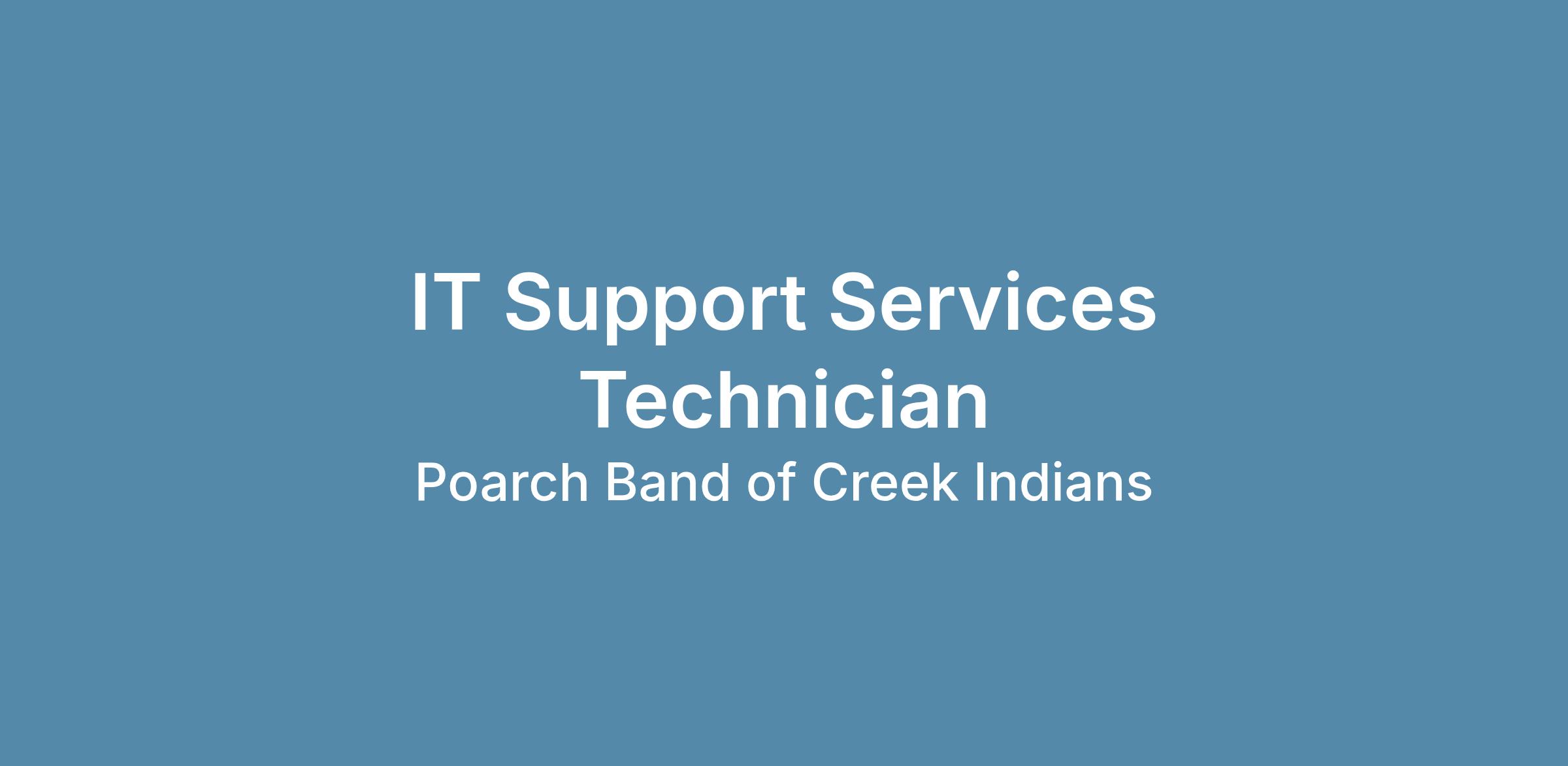 Join Our Mission:The Poarch Creek Indians place a high value on individuals who share our commitment to community, tradition, and progress. As Alabama's only Federally Recognized Native American Tribe, we take pride in a history that spans generations and is deeply rooted in resilience and cultural heritage. Our mission is to uplift the lives of our Tribal Members, preserve our traditions, and drive innovation for a thriving future. If you are passionate about serving with purpose and authenticity while fostering trust, unity, and growth, we welcome you to join us on this meaningful journey.About the Role:The IT Support Services Technician provides front-line technical support to internal users across the organization. This role is responsible for troubleshooting hardware, software, and connectivity issues, resolving IT incidents, and ensuring reliable day-to-day technology operations. The position reports to the IT Support Services Manager and supports the Tribe’s commitment to service, accountability, and integrity.This position reflects PCI’s core values of Perseverance, Opportunity, Accountability, Respect, Culture, and Honesty.Key Responsibilities: