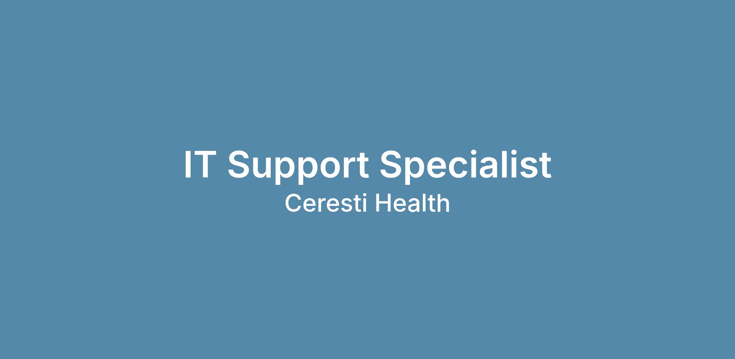 We are seeking a motivated, customer-focused IT Support Specialist to join the Ceresti Health corporate IT team. This role is responsible for providing first-line technical support to internal employees across hardware, software, Apple macOS devices, and Microsoft 365 applications — ensuring our team has the technology they need to perform at their best.