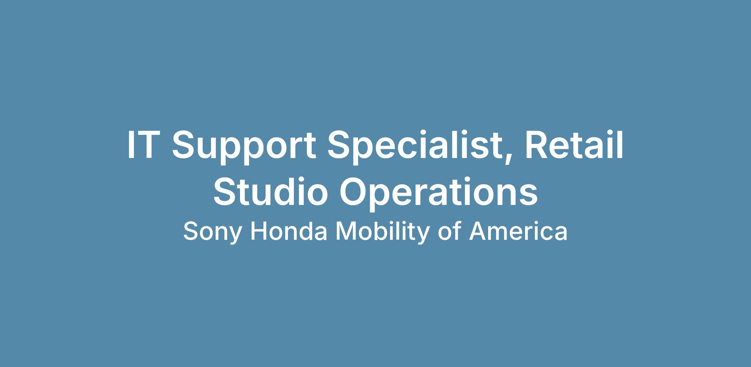 Sony Honda Mobility of America (SHMA) is seeking a highly mobile, customer-focused IT Support Specialist to provide hands-on technical support across our AFEELA retail studio locations in California and Arizona. This is a field-based role for someone who thrives on being on the move, supporting live environments, opening new locations, and ensuring technology works flawlessly where customers experience the brand.