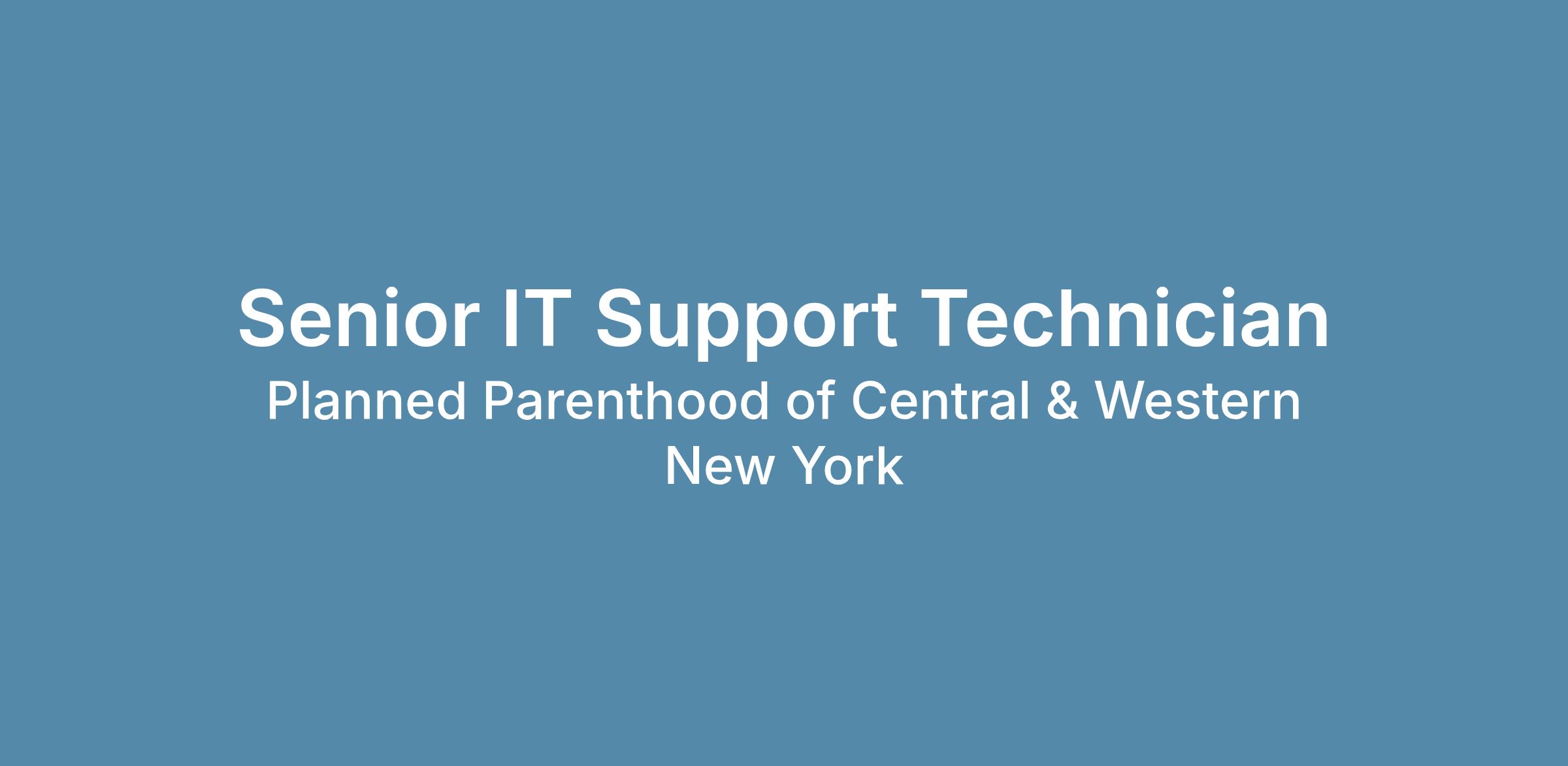 In support of Planned Parenthood of Central and Western New York (PPCWNY)’s mission, the Senior Computer/Network Support Technician has responsibility for technical and administrative support to all end users. The Senior Computer/Network Support Technician maintains a working knowledge of existing hardware, software, and telephone systems in use to maximize efficiency of the network and users’ utilization of them. Assists the Senior Director of IT and Informatics in expanding the PPCWNY IT network and telephone system.