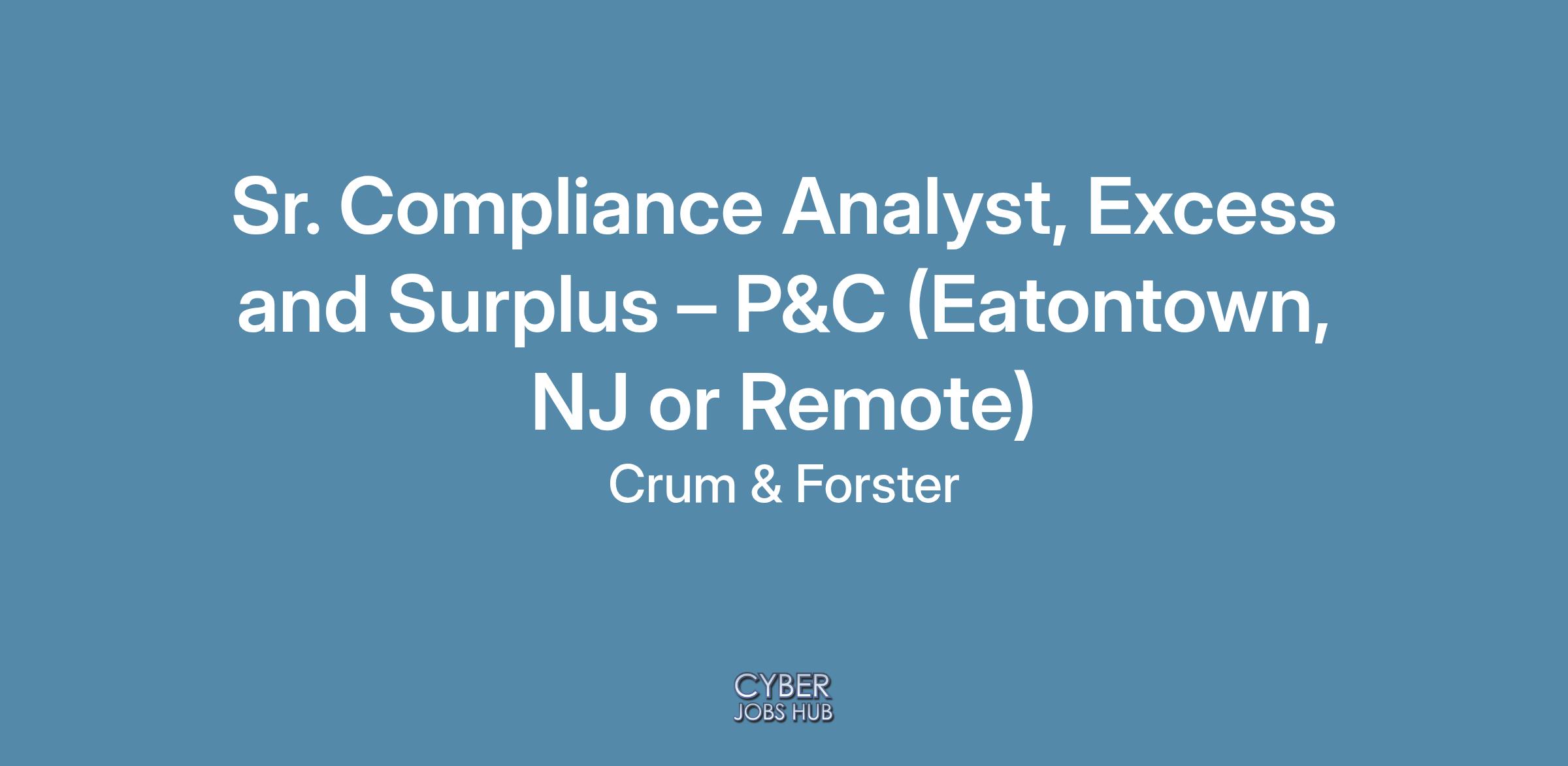 Sr. Compliance Analyst, Excess and Surplus – P&C (Eatontown, NJ or Remote)