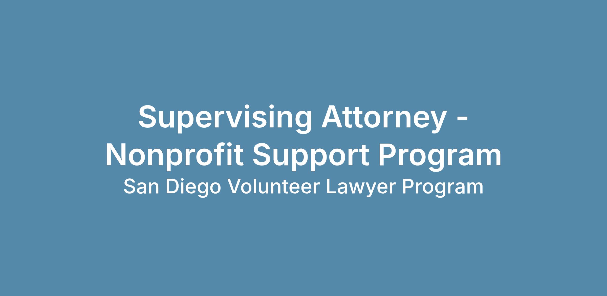- Supervising SDVLP’s Nonprofit Support Program to ensure the delivery of high-quality, pro bono legal services to nonprofit organizations